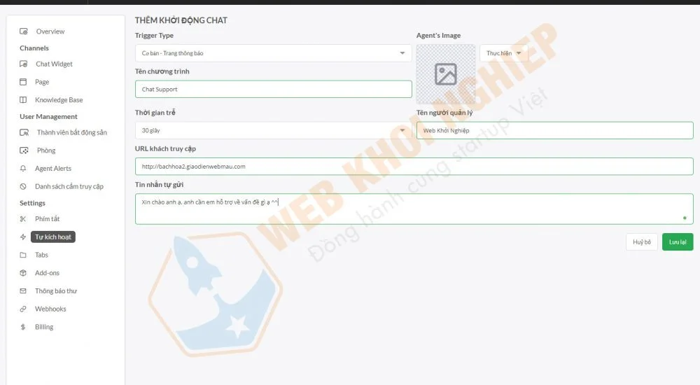 7. Tự kích hoạt: Phần này các bạn có thể thiết lập tùy chọn để sau 1 khoảng thời gian, sẽ thực hiện một hành động theo tùy chỉnh. Phần cơ bản nhất , ví du sau khi khách truy cập trang khoảng 30s, sẽ hiển thị thông báo khách có yêu cầu giúp đỡ gì không. Như mình settup phía dưới:
