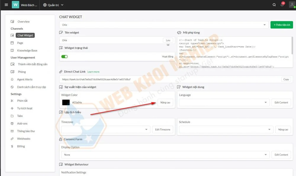 Để chỉnh sửa phần này, các bạn vào Add-ons , sau đó vào Chat Widget, ở phần Sự xuất hiện của Widget, các bạn chọn Nâng cao. Tại đây sẽ có đầy đủ các phần cho bạn tùy chỉnh