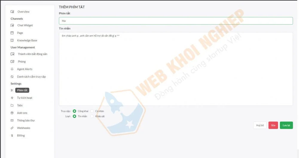 6.Phím tắt: Phần này cho phép bạn thiết lập phím tắt cho các nội dung thường lặp đi lặp lại, giúp bạn tiết kiệm thời gian gõ phím . Sau khi điền phần phím tắt và tin nhắn, bạn bấm lưu lại để lưu phím tắt vừa tạo.