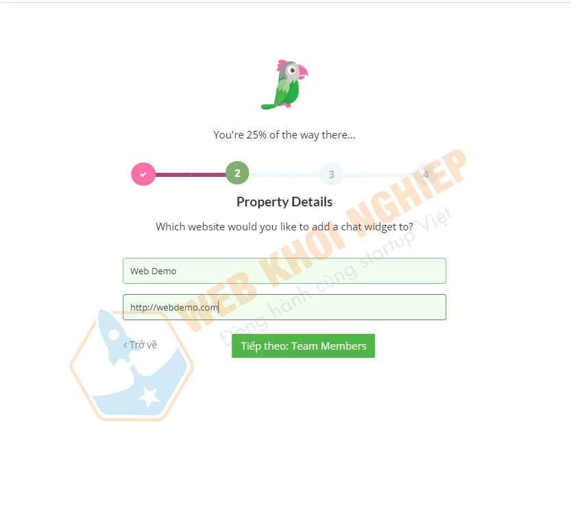 Sau khi đã kích hoạt xong, Trên PC,Các bạn đăng nhập vào tài khoản Tawk.to, và điền tuần tự các bước: