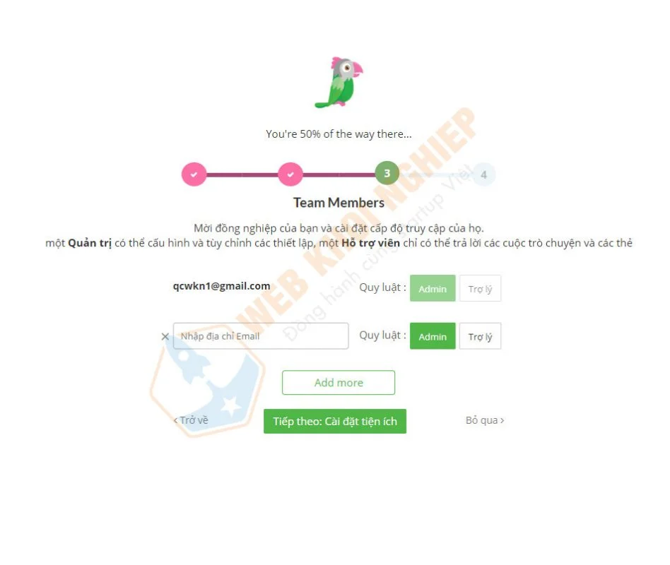 Ở bước này sẽ chọn thêm admin để quản lý tài khoản tawk.to, nếu bạn không cần thiết, có thể bỏ qua bước này