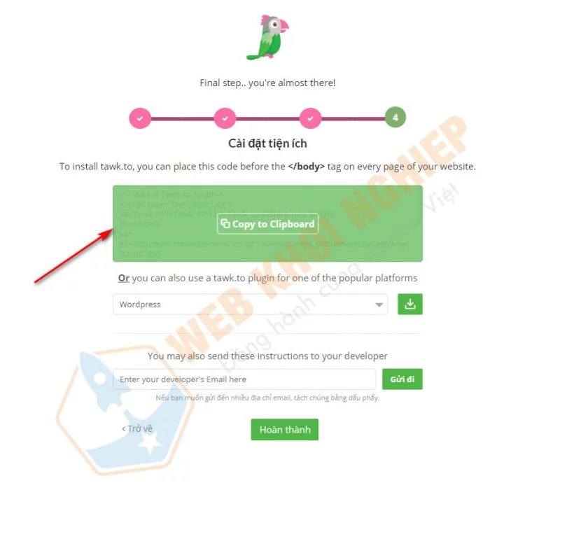 Tới bước này, Tawk.to sẽ hiển thị 1 đoạn code để chèn vào website của bạn. Bạn chỉ cần cop đoạn code này và bỏ vào file header.php, phía trên thẻ <body> là được. Với các website tại Web Khởi Nghiệp, các bạn chỉ cần chèn vào mục Flatsome – Advanced – Global setting.