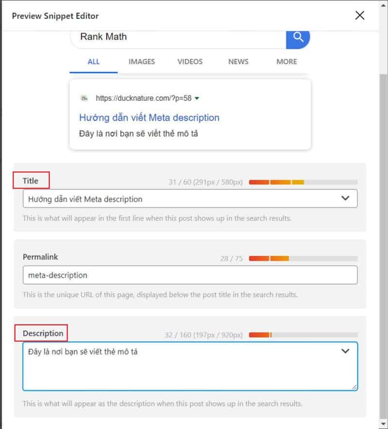 Khi bạn hoàn thành việc viết bài hoặc sản phẩm, Rank Math SEO sẽ mô phỏng cách bài viết của bạn sẽ hiển thị trên Google. Để chỉnh sửa tiêu đề và mô tả, hãy nhấn vào nút Chỉnh sửa Snippet ở phía dưới phần Tổng quan.