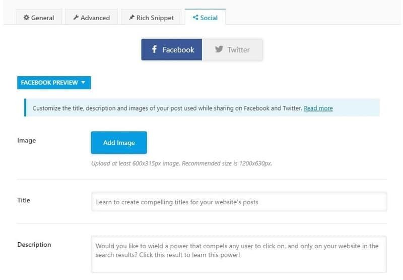 Rank Math SEO cũng hỗ trợ bạn chỉnh sửa phần hiển thị khi chia sẻ bài viết hoặc sản phẩm lên các mạng xã hội Facebook, Twitter. Để làm điều này, bạn chỉ cần chọn tab Mạng xã hội và nhập lại hình ảnh đại diện, tiêu đề và mô tả. Tiêu đề và mô tả sẽ được tự động lấy từ phần Tổng quan, vì vậy bạn chỉ cần cập nhật lại hình ảnh đại diện.