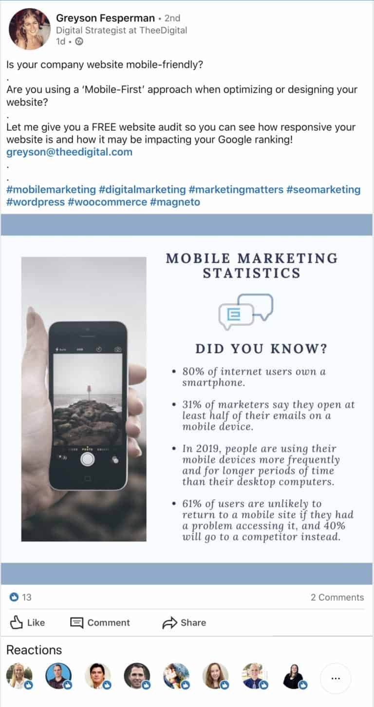 Sự tham gia của nhân viên sẽ xây dựng cộng đồng trực tuyến của bạn một cách tự nhiên và dễ hiểu. LinkedIn là một ví dụ tuyệt vời về cách thức hoạt động của điều này. Bạn có thể có một trang công ty nơi bạn đăng các sự kiện và chia sẻ bài viết, nhưng để nhận được nhiều lưu lượng truy cập và mức độ tương tác hơn nữa, hãy yêu cầu nhân viên của bạn chia sẻ và nhận xét về những bài đăng này.